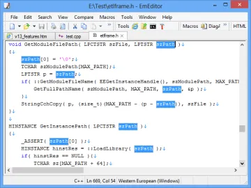 EmEditor proporciona resaltado de sintaxis para 20 idiomas diferentes, incluidos C ++, Java, HTML, Perl, Python y muchos más. También puede crear fácilmente sus propias reglas de resaltado personalizadas. Con la edición de selección múltiple de EmEditor, puede realizar cambios en varias ubicaciones en su documento de forma simultánea: utilícelo para cambiar el nombre de variables, ingresar datos y, en general, hacer su vida más fácil. La Edición de Selección Vertical le permite seleccionar y reemplazar, o insertar, texto en formato de columna. Se puede acceder fácilmente a la edición de selección vertical manteniendo presionada la tecla ALT mientras hace clic y arrastra el mouse sobre el texto.